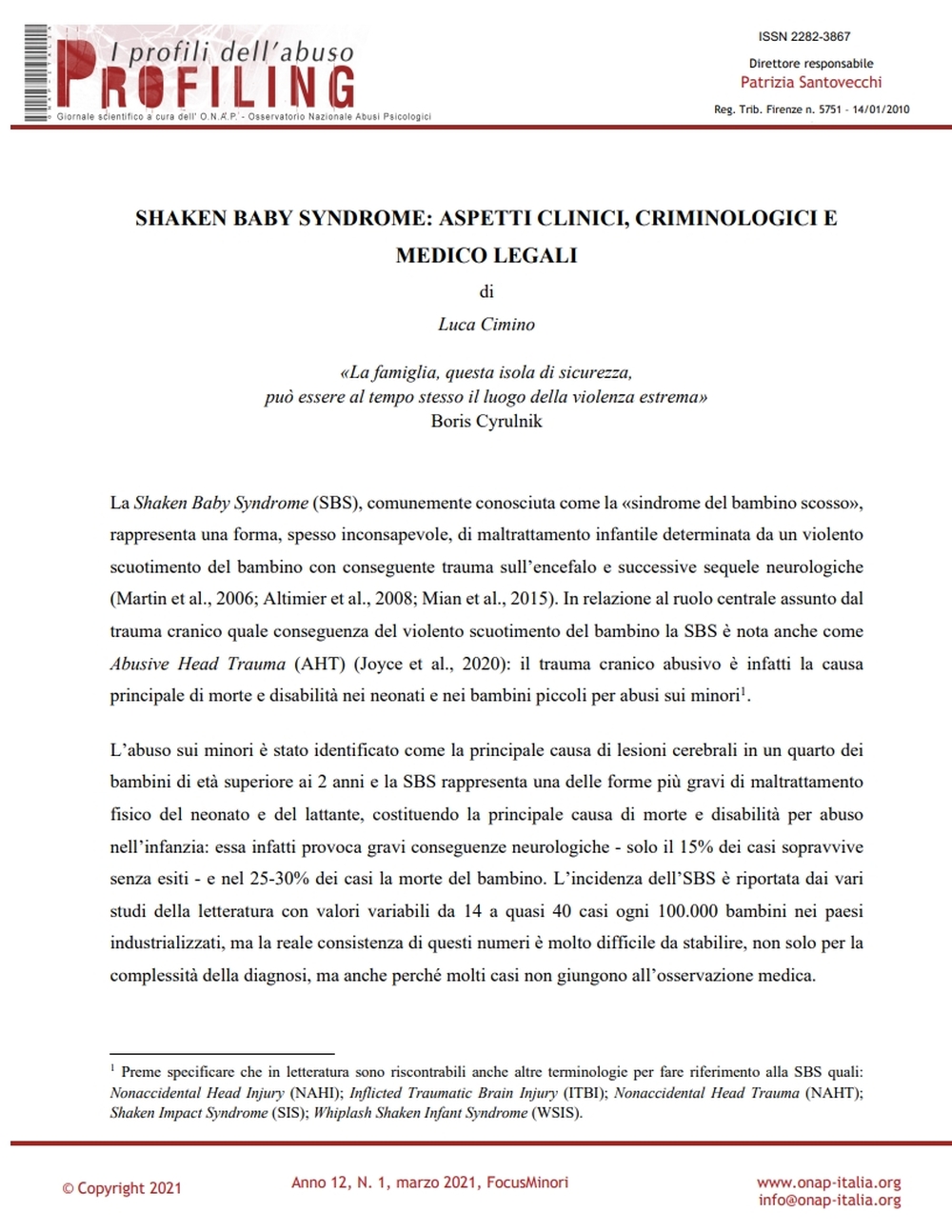 L. Cimino, Shaken baby syndrome: aspetti clinici, criminologici e medico legali, in Profiling- I profili dell'abuso, 2021.