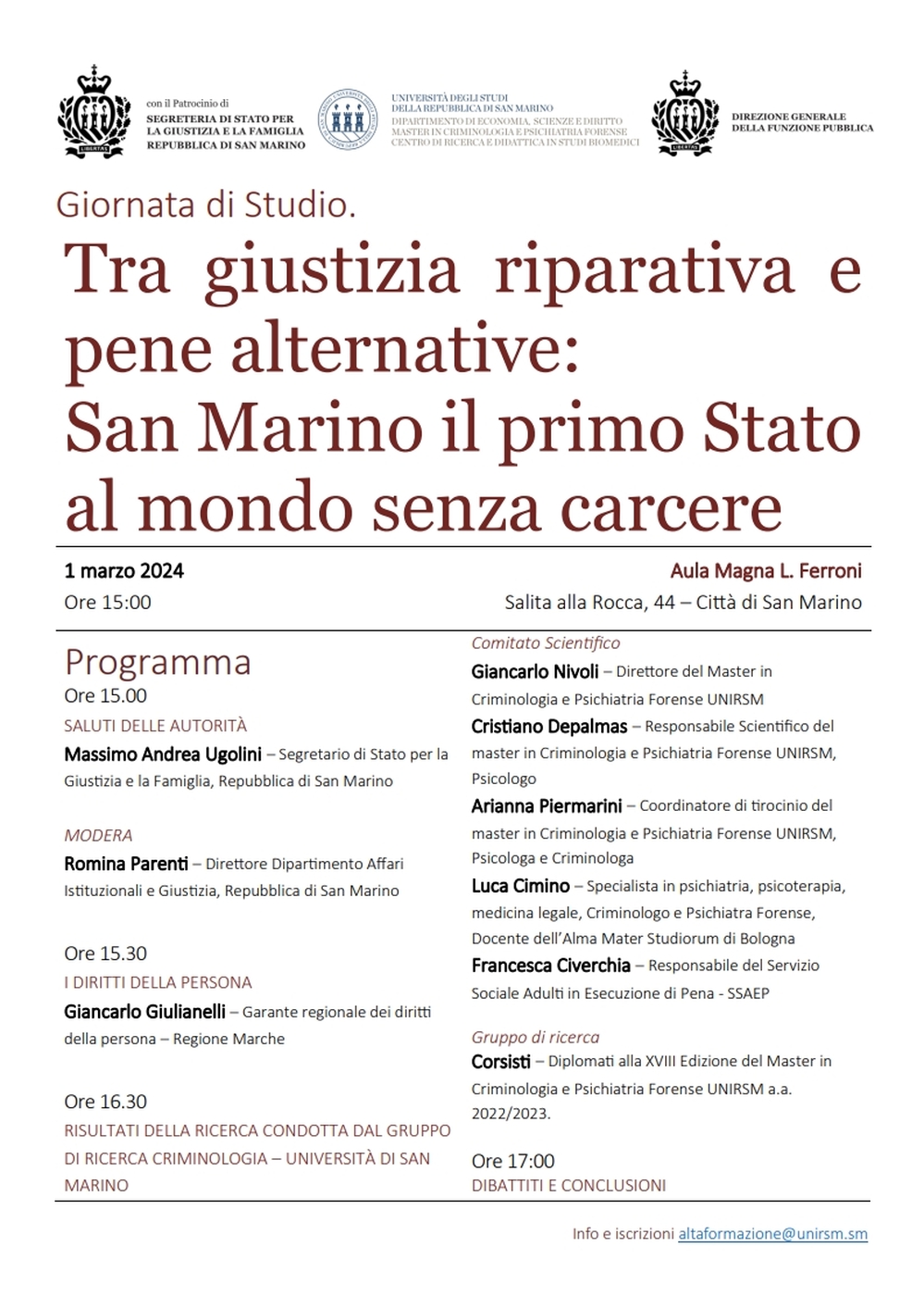 "TRA GIUSTIZIA RIPARATIVA E PENE ALTERNATIVE: San Marino il primo Stato al mondo senza carcere"