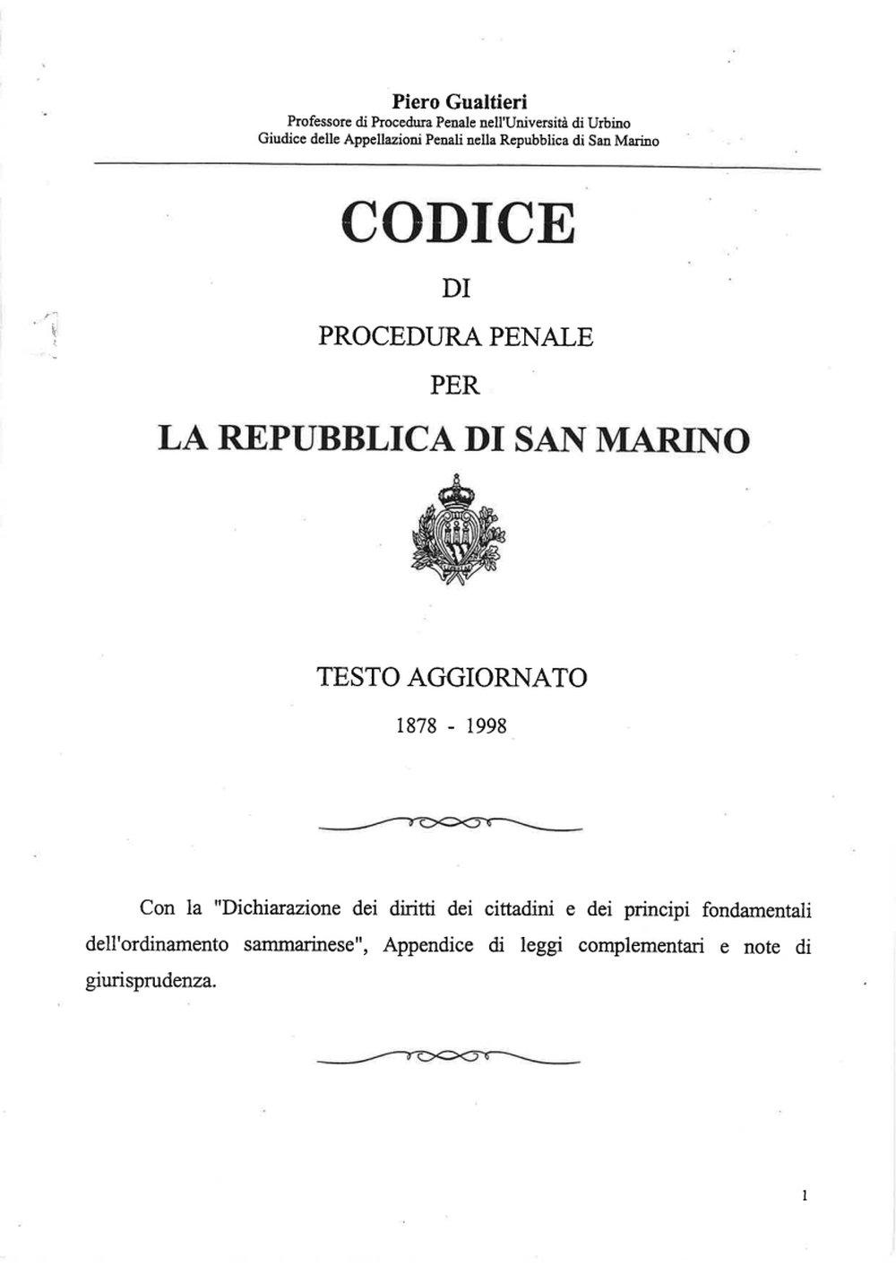 1878-1998, P. Gualtieri, Codice di Procedura Penale per la Repubblica di San Marino.