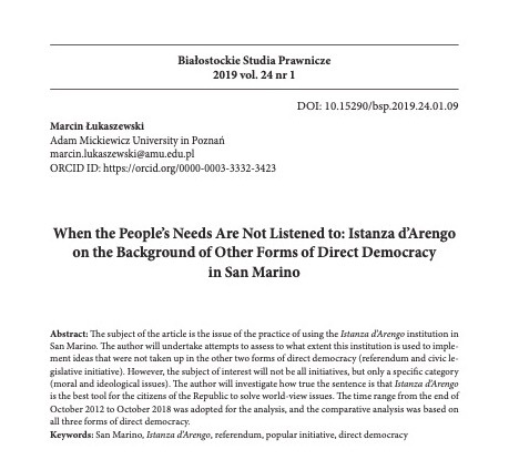 M. Łukaszewski, When the People’s Needs Are Not Listened to: Istanza d’Arengo on the Background of Other Forms of Direct Democracy in San Marino, in Białostockie Studia Prawnicze, Vol. 24, nr 1, 2019.